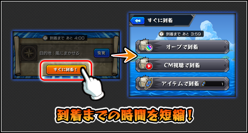 「#秘海の冒険船」専用アイテム「秘海の水時計」や、「オーブ」「CM視聴」を使用すると、4時間かかる航海時間が時間経過を待たずに到着できる⌛️